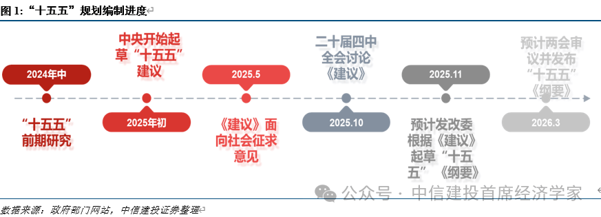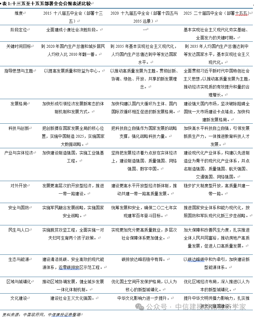 1。 五年规划总体思的演变,表现了政策的取时俱进。增速方针逐步柔性化,而立异、生态、平安等范畴的束缚则更凸起。2。 《公报》把“扶植现代化财产系统,巩固强大实体经济根底”提到表述的靠前,“新质出产力”初次纳入全会的规划框架。3。 经济成长愈加注沉 “质的无效提拔和量的合理增加”,把“无效市场和无为相连系”写入准绳。党的二十届四中全会于10月20日至23日正在举行,全会审议通过了《地方关于制定国平易近经济和社会成长第十五个五年规划的》。本次四中全会的焦点使命是审议《关于制定国平易近经济和社会成长第十五个五年规划的》。依以往老例,五中全会凡是审议五年规划,本年改由四中全会承担。会议对将来五年成长做出了顶层设想、计谋擘画,估计《》全文将于近期正式发布。正在此根本上,发改委将牵头草拟“十五五”规划《纲要》,于来岁审议并正式发布。《公报》明白了“十五五”期间的汗青定位为“根基实现社会从义现代化夯实根本、全面发力的环节期间,正在根基实现社会从义现代化历程中具有继往开来的主要地位”。这必然位取此前“根基实现社会从义现代化”的2035年近景方针一脉相承,进一步表现了地方实现中持久成长方针的决心。对将来5年我国形势的判断上,公报指出,“十五五”期间我国成长面对深刻复杂变化,我国成长处于计谋机缘和风险挑和并存、不确定难意料要素增加的期间。但同时,中国特色劣势、完整财产系统劣势、丰硕人才资本劣势愈加彰显。近年来,全球地缘形势愈加复杂严峻,中美持久合作的款式短期难以扭转,“十五五”期间将愈加关心强化布局性韧性,持久成长潜力,而非逃求纯真规模领先。估计“十五五”经济增速方针设置将较为矫捷,更凸起“提质增效”。《公报》提出了“十五五”期间经济社会成长的次要方针:高质量成长取得显著成效,科技自立自强程度大幅提高,进一步全面深化取得新冲破,社会文明程度较着提拔,人平易近糊口质量不竭提高,斑斓中国扶植取得新的严沉进展,樊篱愈加巩固。正在此根本上再奋斗五年,到2035年实现我国经济实力、科技实力、国防实力、分析国力和国际影响力大幅跃升,人均国内出产总值达到中等发财国度程度,人平易近糊口愈加幸福夸姣,根基实现社会从义现代化。《公报》把“扶植现代化财产系统,巩固强大实体经济根底”提到表述的靠前,强调先辈制制业是现代化财产系统的,要求加速扶植制制强国、质量强国、航天强国、交通强国、收集强国。此中,深化计谋性新兴财产和前瞻成长将来财产是沉中之沉。对于保守财产,则需要加快高端化、智能化、绿色化、融合化升级。“新质出产力”初次纳入全会的规划框架。《公报》提出“加速高程度科技自立自强,引领成长新质出产力”。近几回五年规划中,科技立异地位一直凸起。十九届五中将“科技自立自强”上升为计谋支持。二十届四中正在此根本上升级“新质出产力”表述,并强化“教育科技人才一体推进”。中国目前正在全球制制业邦畿中规模最大、财产链最完整、正在若干新兴制制范畴劣势显著。取此同时,短板正在于立异能力取高质量成长要求仍不婚配,沉点范畴环节环节使命仍然艰难,环绕环节焦点手艺取原始立异的攻关仍需加力。因而,“十五五”规划无望继续加码高手艺取财产自立自强。成长款式上,进一步强调“扶植强大国内市场”,提出“障碍全国同一大市场扶植卡点堵点”。要求惠平易近生和促消费、投资于物和投资于人慎密连系,此中,《公报》5次提到“平易近生保障”相关表述,表白内需和平易近生仍是宏不雅政策发力的主要抓手。宏不雅政策方面,公报将“无效市场+无为”并置强调,提出政策要持续发力、当令加力。相较十四五《》方向打制高尺度市场系统,本次更凸起市场取的互补分工取宏不雅管理效能,有益于理解后续正在环节要素市场化取财产政策之间的政策组合。具体而言,环节词包罗“深切实施提振消费专项步履”“落实企业帮扶政策”“兜牢下层底线” “强化食物药品平安全链条监管”等。次要风险方面,对房地产的表述为“鞭策房地产高质量成长” ,对处所债权问题,表述为“积极稳妥化解处所债权风险”。我们认为,防备化解系统性风险将以制、工程化和前瞻性办理为焦点,稳步实现处所债权风险出清。而将房地产表述放正在平易近生保障板块,表白将继续多措并举建立房地产成长新模式,愈加强调保障房扶植和收储问题。五年规划总体思的演变表现了政策的取时俱进。“十一五”强调总量扩张取要素投入,“十二五”改为总量取布局并沉,“十三五”以高质量成长和供给侧为焦点,“十四五”提出了“2035持久增加方针、、数字化管理”的新范式。进入“十五五”,正在延续上述从线的同时凸起“质的无效提拔和量的合理增加”,把“无效市场和无为相连系”写入准绳,进一步强调“新质出产力”和“强大国内市场”双支柱,并推进轨制型、系统和能力现代化,做为迈向2035年的环节跟尾放置。规划思从“专题枚举”“、方针、抓手、保障”的闭环,增速方针逐步柔性化,而立异、生态、平安等范畴的束缚则更凸起。总的来看,从“十三五”到“十五五”,立异驱动取高质量成长贯穿一直。成长款式履历新常态阶段、双轮回阶段、